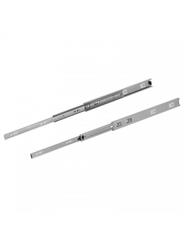 Descritivo Técnico: Corrediça telescópica de abertura total, com curso prolongado em 27 mm do comprimento nominal, com deslizamento por esferas de aço. Peça única de montagem lateral e autotravante no final do curso, com travas que permitem a retirada da gaveta.
