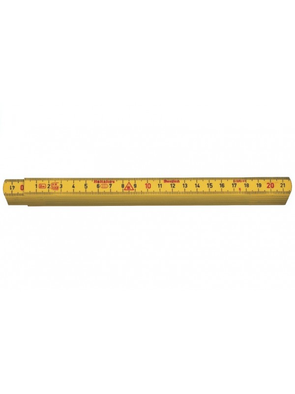 Régua dobrável feita de poliamida e fibra de vidro, proporcionando maior resistência à umidade. Escala métrica em preto de ambos os lados e figuras em decímetros vermelhos.