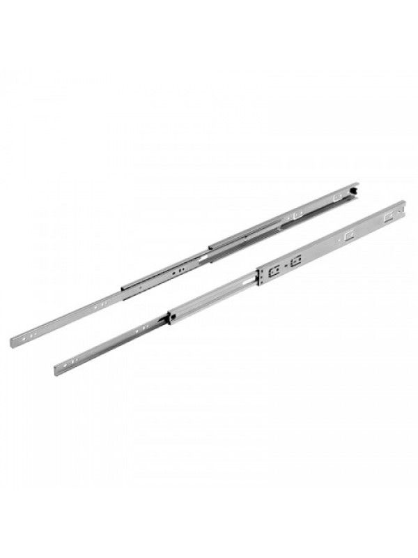 Descritivo Técnico: Corrediça telescópica de abertura total do comprimento nominal, com deslizamento por esferas de aço, peça única de montagem lateral e autotravante no final do curso com travas que permitem a retirada da gaveta.